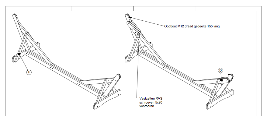 Monteer de balken van 110 cm tussen de schuine poten en de voeten. Dit maakt je standaard veel stabieler. Boor voor en schroef vast met de 8 cm schroeven.